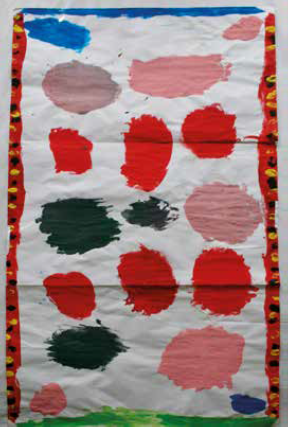 Kasper: Dit zijn drie hele grote vellen aan elkaar geplakt. Alle kleuren zijn helemaal gemengd. Roze is rood met wit, soms weinig, soms heel veel. Blauw is donkerblauw en lichtblauw door elkaar. Dat rode, daar zit een beetje zwart en beetje wit doorheen, zo blijft het mooi rood. Soms deed ik zelfs mengsels in mengsels. En dat donkergrijze? Dat zijn alle
