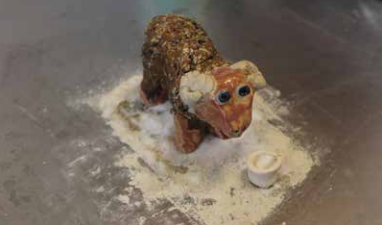 "Ik heb het schaap niet zelf gemaakt, hoor, het stond hier altijd op het aanrechtblok. Het is gemaakt door Leonie. Ik zat hier vaak, vooral tijdens de gespreksrondes. Dan was ik wel aan het luisteren, maar tegelijkertijd hiermee bezig. Het was een soort vluchtroute. Ik ging met klei en suiker de omgeving van het schaap maken. Ik begon de suiker netjes te verdelen en met de snippers van een roerstokje maakte ik stro voor in het bakje. Zo zorgde ik voor het schaap. Als Leonie vroeg of ik wilde aanschuiven, deed ik dat heel even en dan ging ik snel terug naar het aanrecht. Op een gegeven moment ging ik soms even bij de groep zitten maar hier op het hoekje, zodat ik snel terug kon. Pas een half jaar later lukte het me om aan de tafel te zitten tussen de anderen. Het is een heel proces geweest, vandaar de titel: Proces Schaap. In maart was de therapie afgerond, maar het schaap staat er nog steeds."